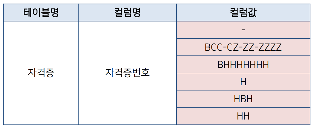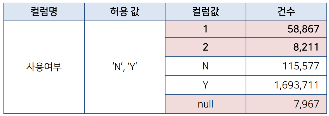 여부 컬럼에 허용 값 이외의 0, 1, Null 등이 존재하는 경우나 코드 컬럼에 허용 코드 값을 벗어난 값이 입력되어 있는 경우 이다.