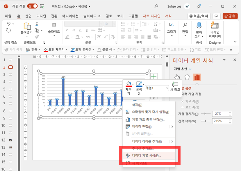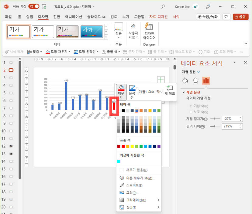막대그래프 한개만 클릭한 뒤 그 상태에서 우클릭을 해서 채우기 툴을 이용하면 된다.
