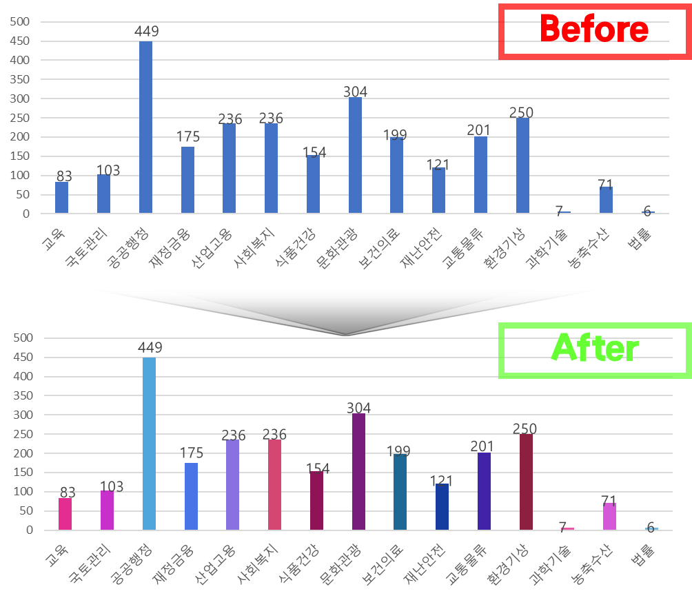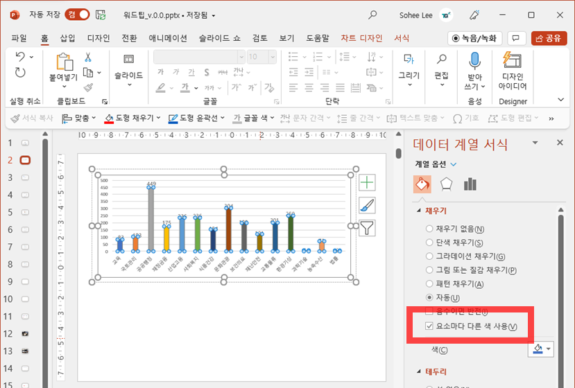 막대그래프에서 우클릭 ➡️ "데이터 계열 서식" ➡️ "채우기" ➡️ "요소마다 다른색 사용" 체크