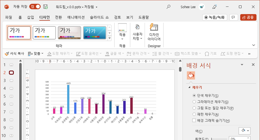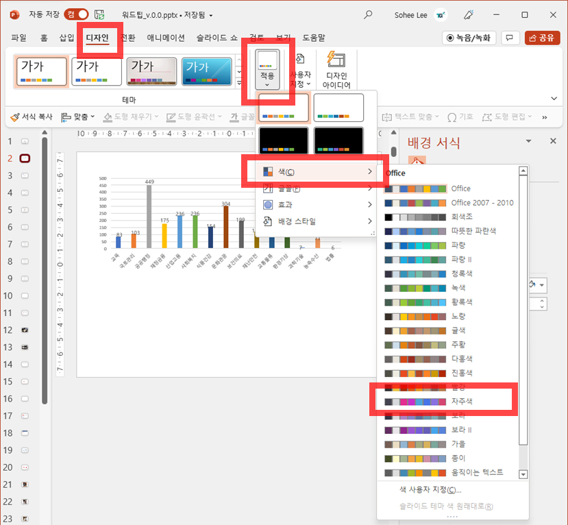 "디자인" ➡️ "적용" ➡️ "색" ➡️ 마음에 드는 컬러파레트 고르기