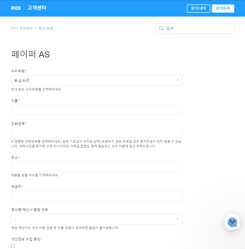 간단히 수리접수 고객을 식별할 수 있는 정보와 수리비 입금자 정보 등을 입력하면 끝난다.