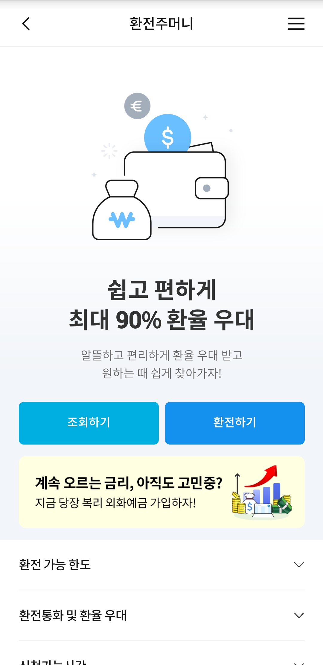 어플에서 미리 환전을 하면 우대를 90% 받을 수 있고, 은행을 직접 가지 않고 공항에서 바로 수령이 가능하다.