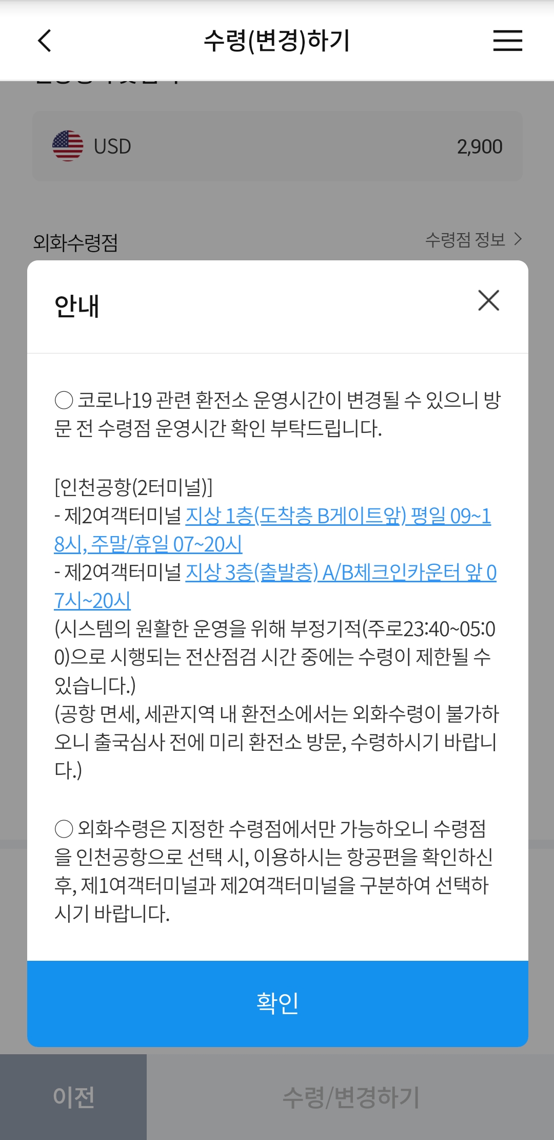 인천공항 제2터미널에서 수령이 가능한 환전소의 위치 및 시간은 아래 표와 같다. (2022년 9월 기준)
